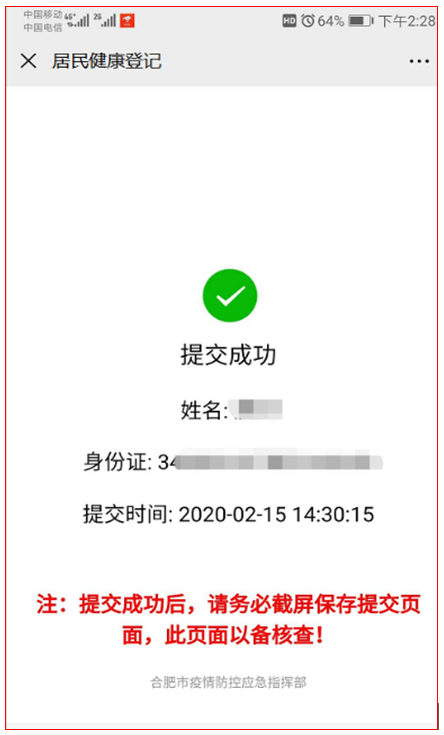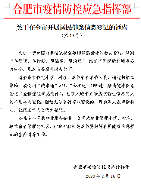 请全市各住宅小区、村庄、单位宿舍居住人员,通过扫描二维码,或使用“皖事通”APP、“合肥通”APP进行居民健康信息登记(操作流程详见附件)。已在入城卡点采集核验过信息的人员不用再次登记。因故无法自行完成登记的,可由家人或申请物业、社区工作人员代为登记。
