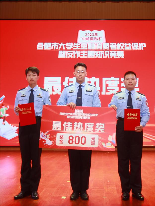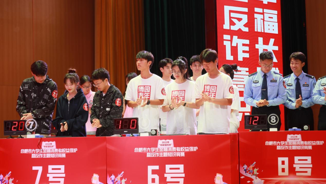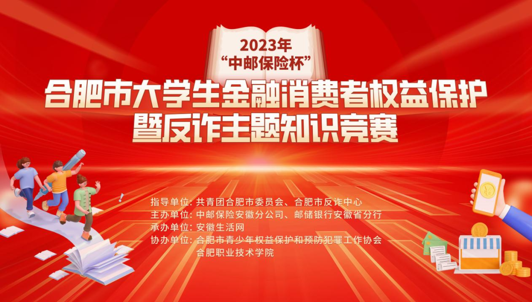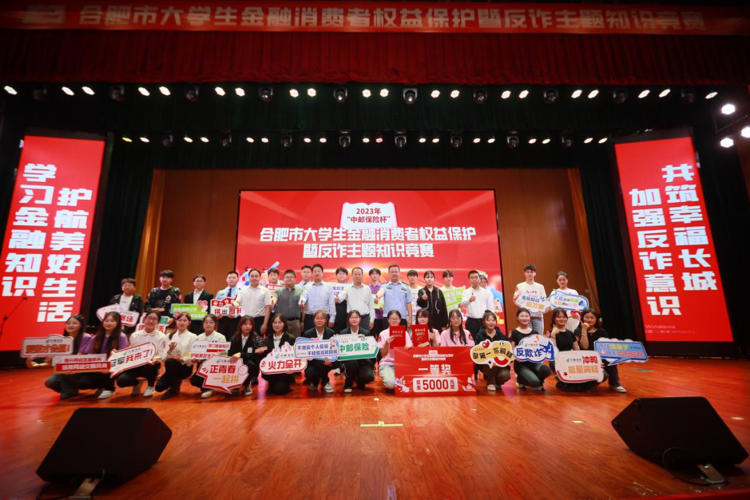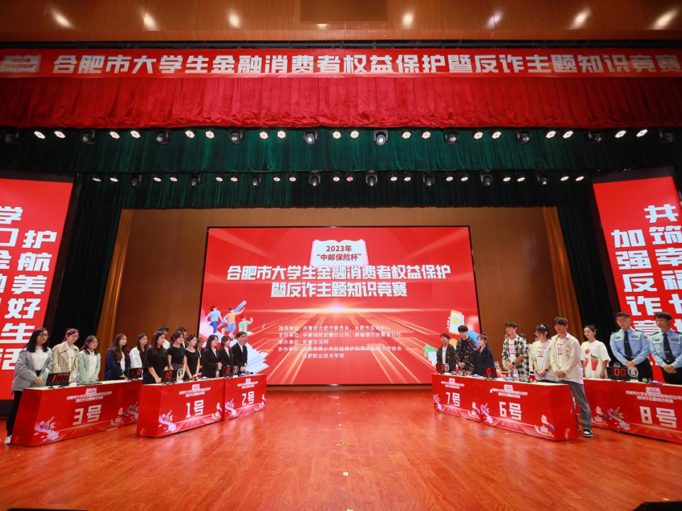 9月23日下午,由共青团合肥市委员会、合肥市反诈中心指导,中邮保险安徽分公司、邮储银行安徽省分行主办的2023年“中邮保险杯”合肥市大学生金融消费者权益保护暨反诈主题知识竞赛决赛在合肥职业技术学院成功举办。本次竞赛旨在帮助大学生牢固树立金融风险防范意识,提升大学生金融素养水平,推动广大高校大学生在金融消费者权益保护和反诈知识教育中做到学思践悟、知行合一。