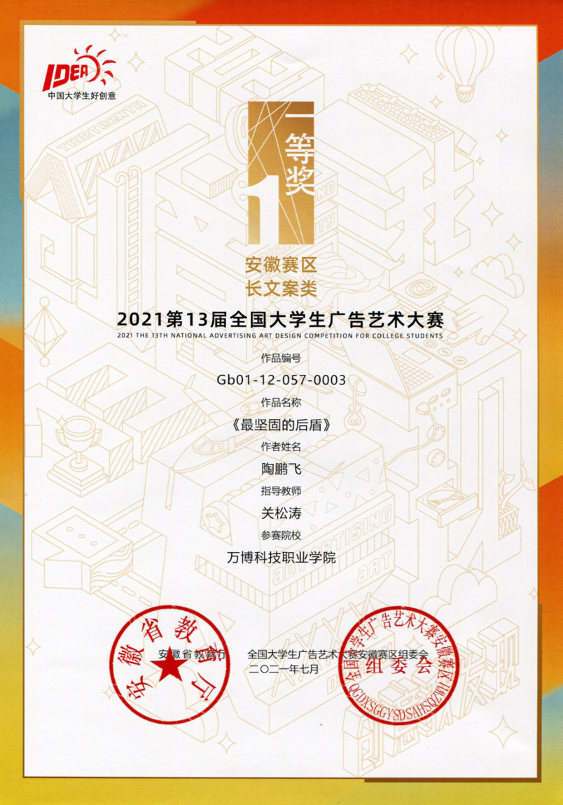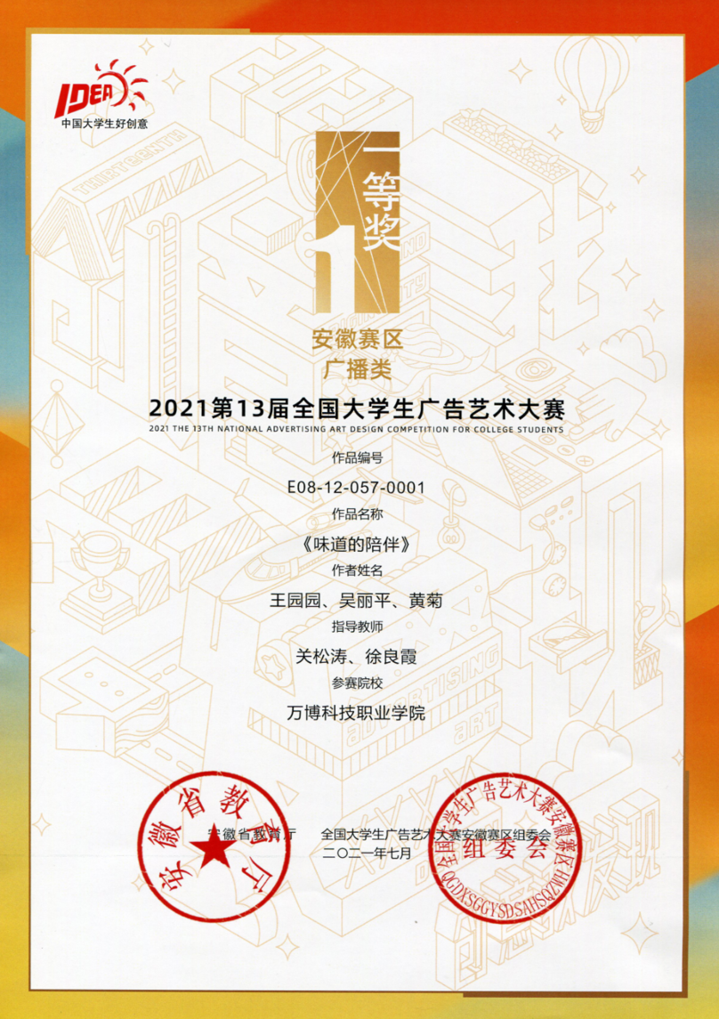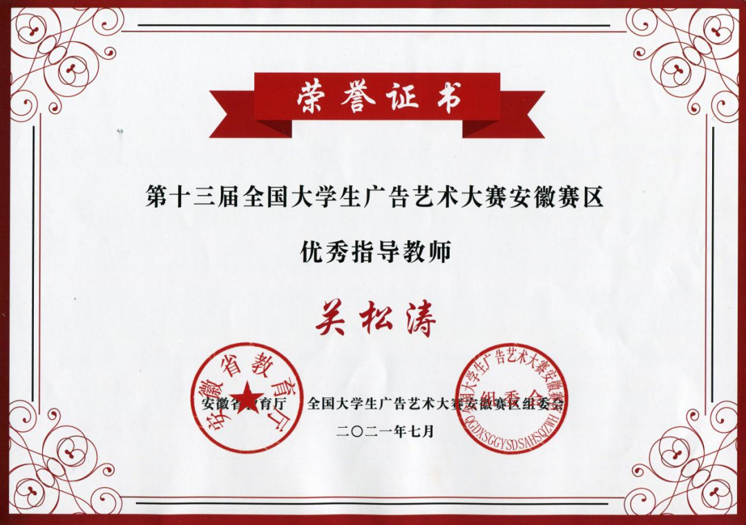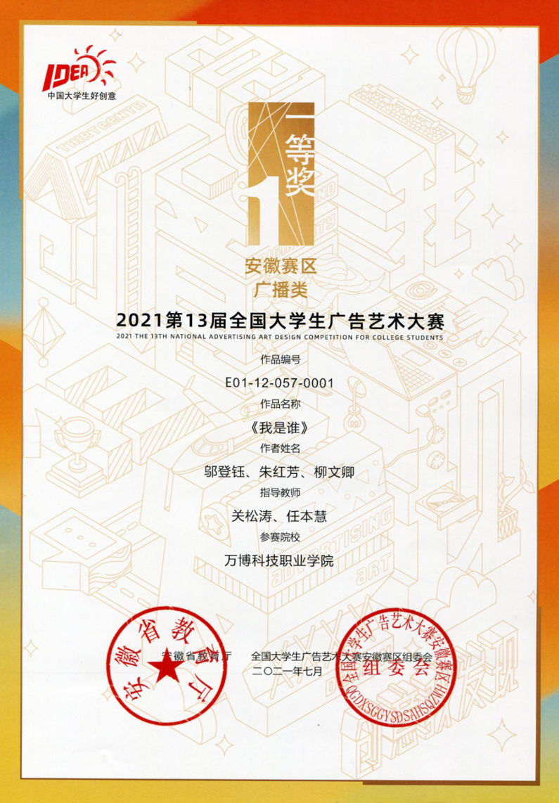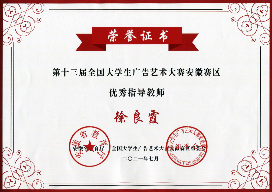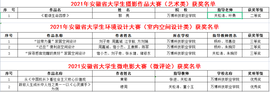 日前,随着安徽省大学生创新创业教育办公室对2021年度第四季度的学科竞赛获奖信息的公示结束,我校艺术传媒学院在2021年度共参加各类学科技竞赛8项,获得一等奖5项,二等奖8项,三等奖19项,优秀奖和入围奖130余项,优秀组织奖3项,优秀指导教师奖12人次。本年度我校在学科竞赛中无论是参赛的类别、次数和获奖等级均再创新高。