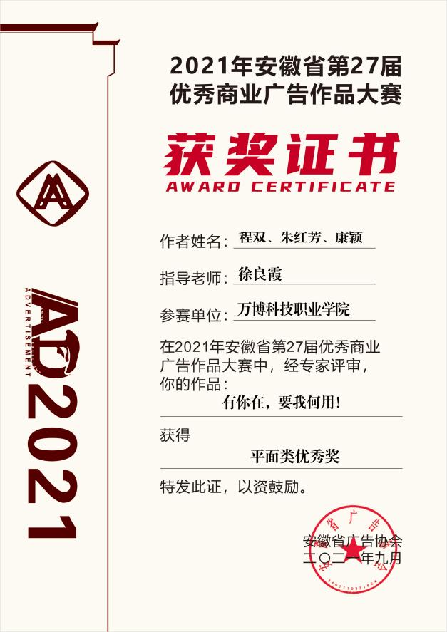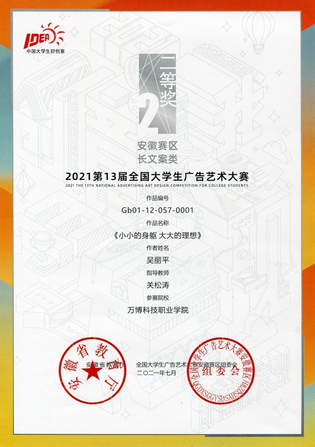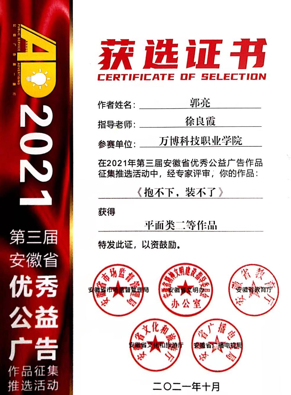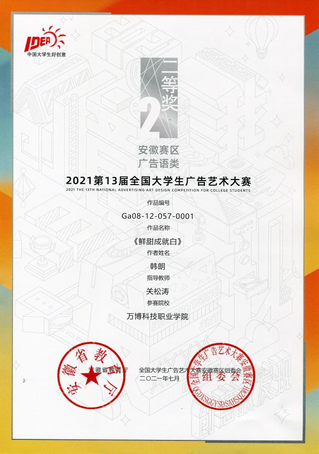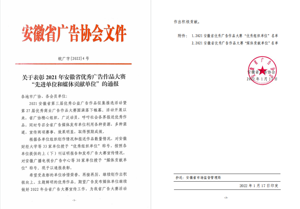 日前,随着安徽省大学生创新创业教育办公室对2021年度第四季度的学科竞赛获奖信息的公示结束,我校艺术传媒学院在2021年度共参加各类学科技竞赛8项,获得一等奖5项,二等奖8项,三等奖19项,优秀奖和入围奖130余项,优秀组织奖3项,优秀指导教师奖12人次。本年度我校在学科竞赛中无论是参赛的类别、次数和获奖等级均再创新高。